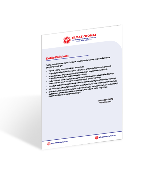 Yılmaz Otomat, iatf 16949 kalite yönetim sertifikasının yanı sıra iso 9001:2015 kalite sertifikasına da sahiptir. Firma olarak ``Sizin işiniz, Bizim işimiz`` düşüncesi ile üretimlerimize devam etmekteyiz.